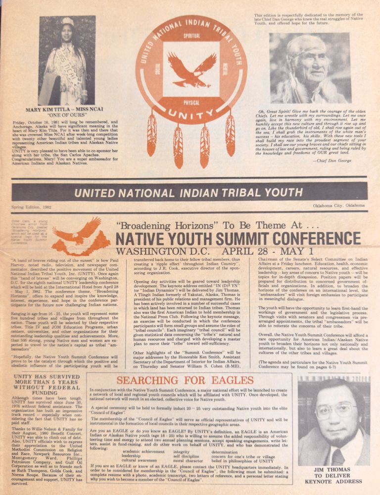 1980s — Council of Eagles: UNITY Created the Council of Eagles which was made up of selected Na- tive youth who served as UNITY ambassadors. The first Council of Eagles included Mary Kim Titla, Vivian Juan Saunders, Rose Abrahamson, Arvo Mikkanen, and Darrell Mease.