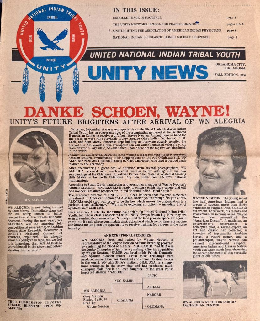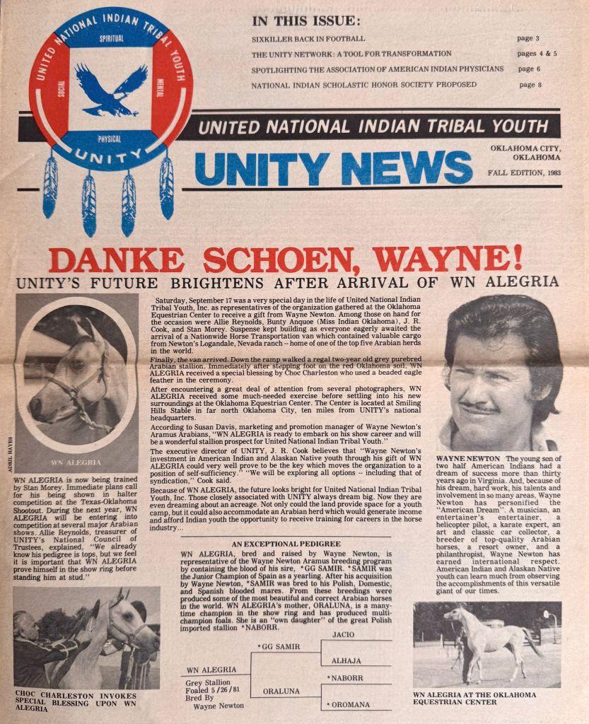 1980 — Wayne Newton: Wayne Newton, Las Vegas icon and well-known singer and entertainer, donated an Arabian stallion, “WN Alegria,” to UNITY.
