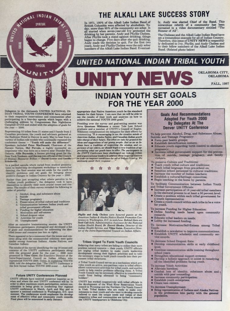 1980s — 2000 Campaign: UNITY first received federal funding in the late 80s for a program entitled the American Indian/Alaska Native Youth 2000 Campaign. The program resulted in the Healing Generation’s Journey to the Year 2000, a publication that set forth twelve strategies for addressing Native youths’ issues of greatest concern.