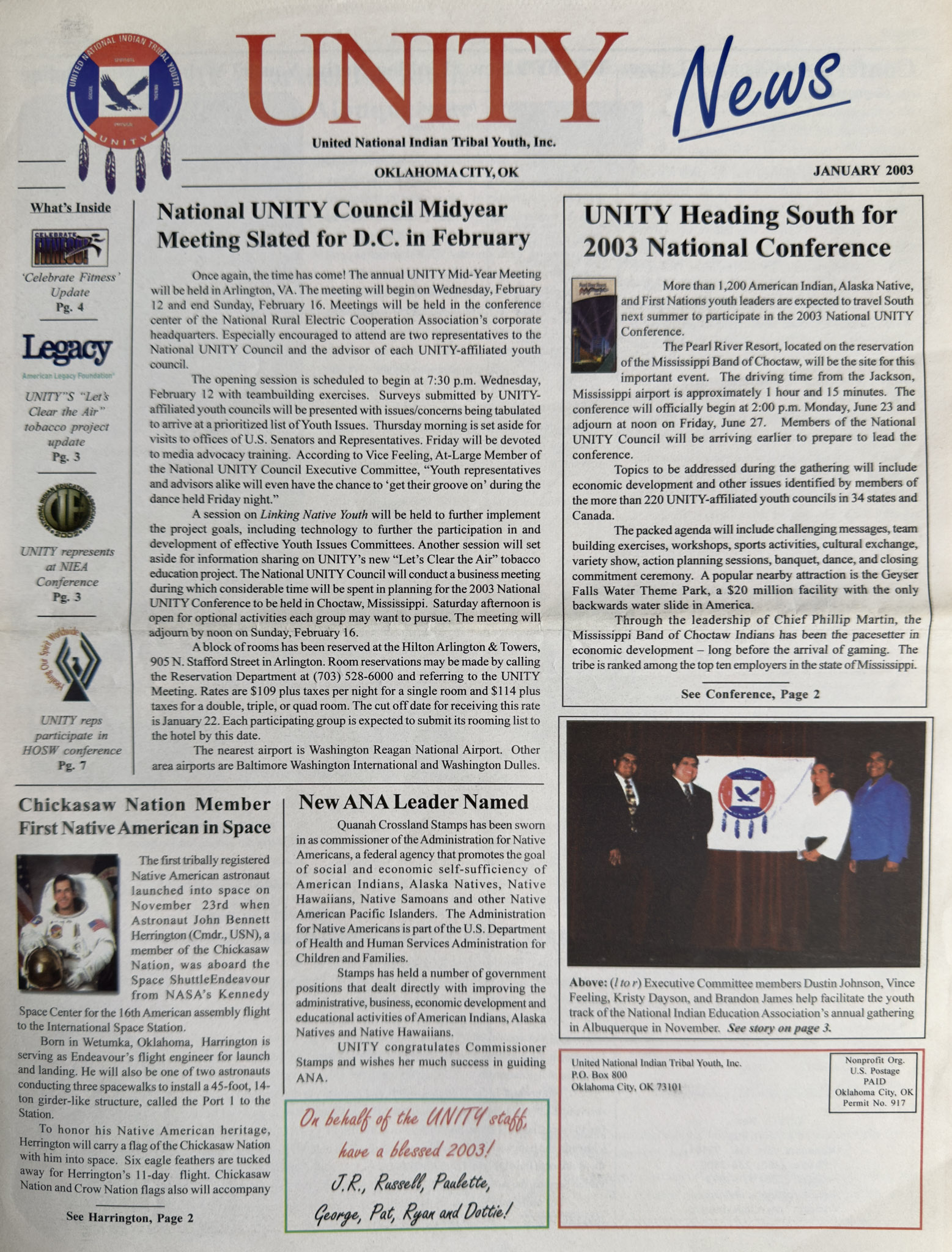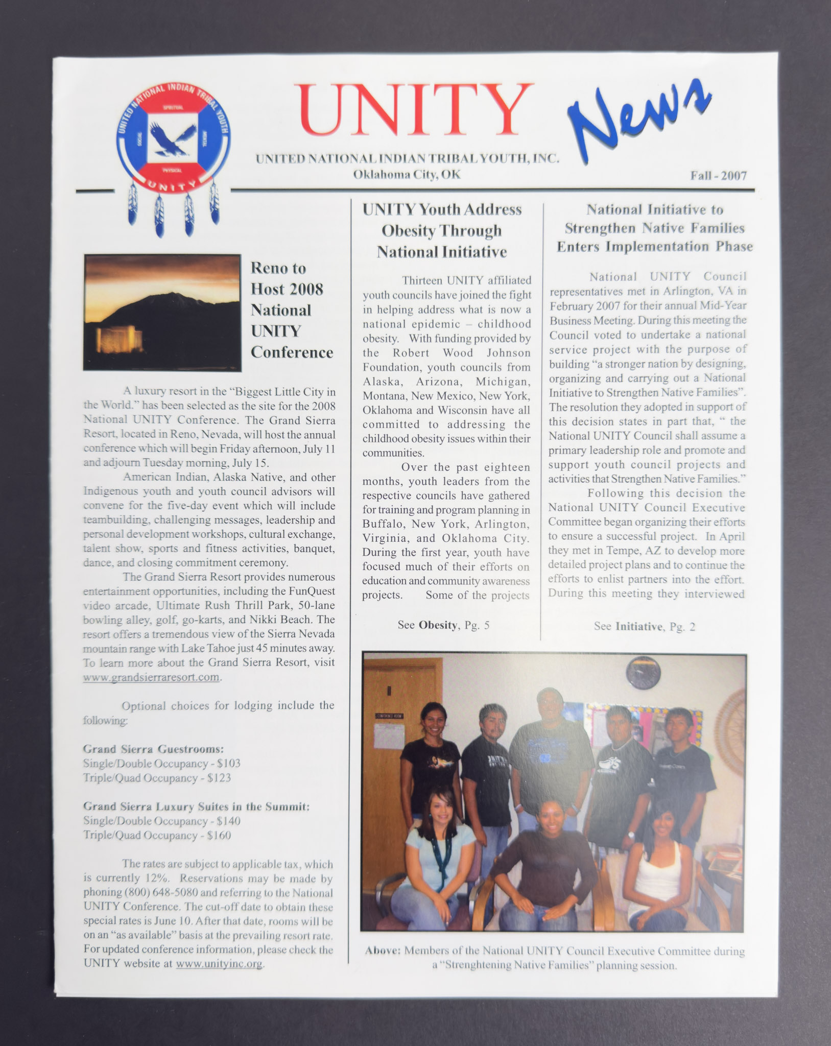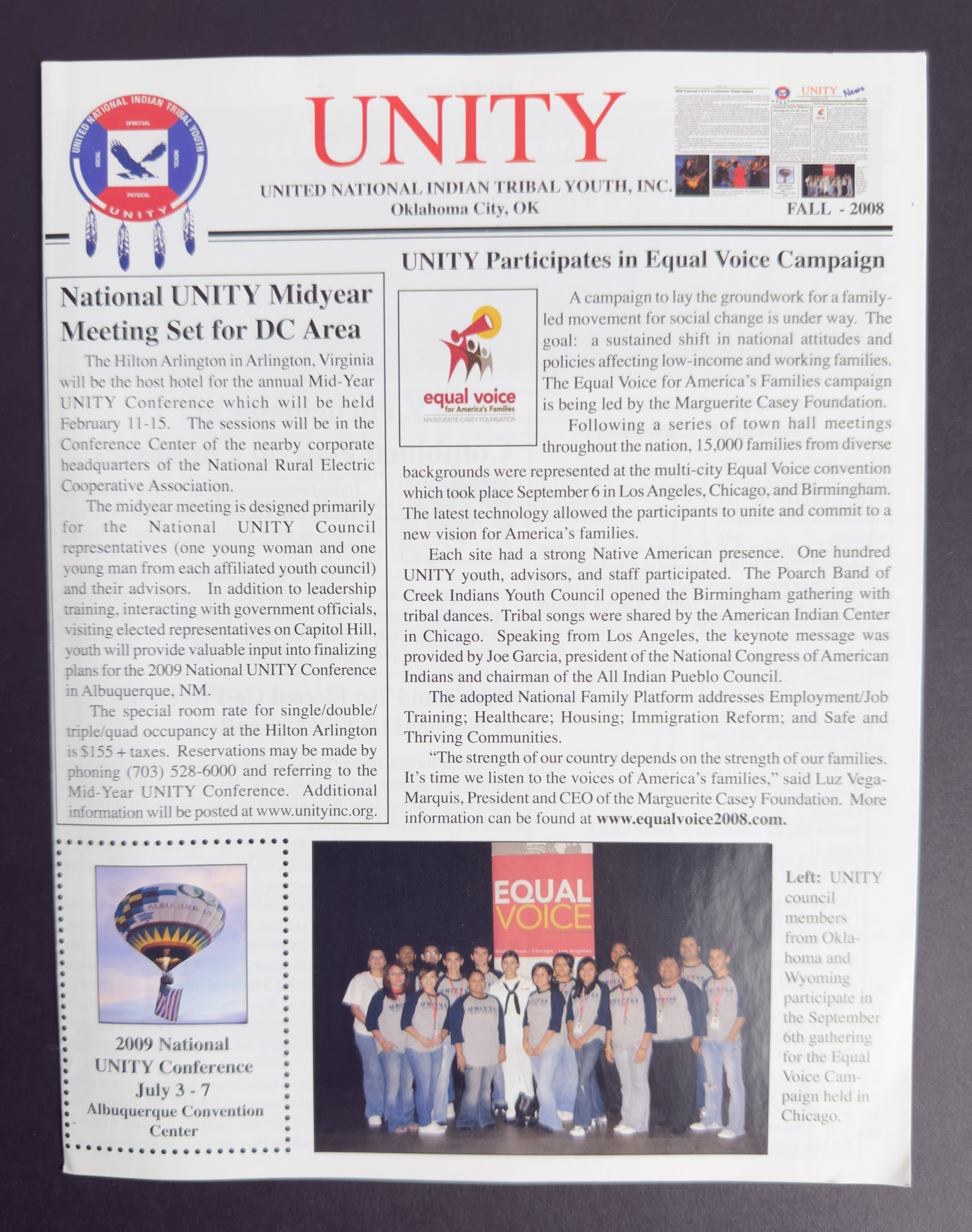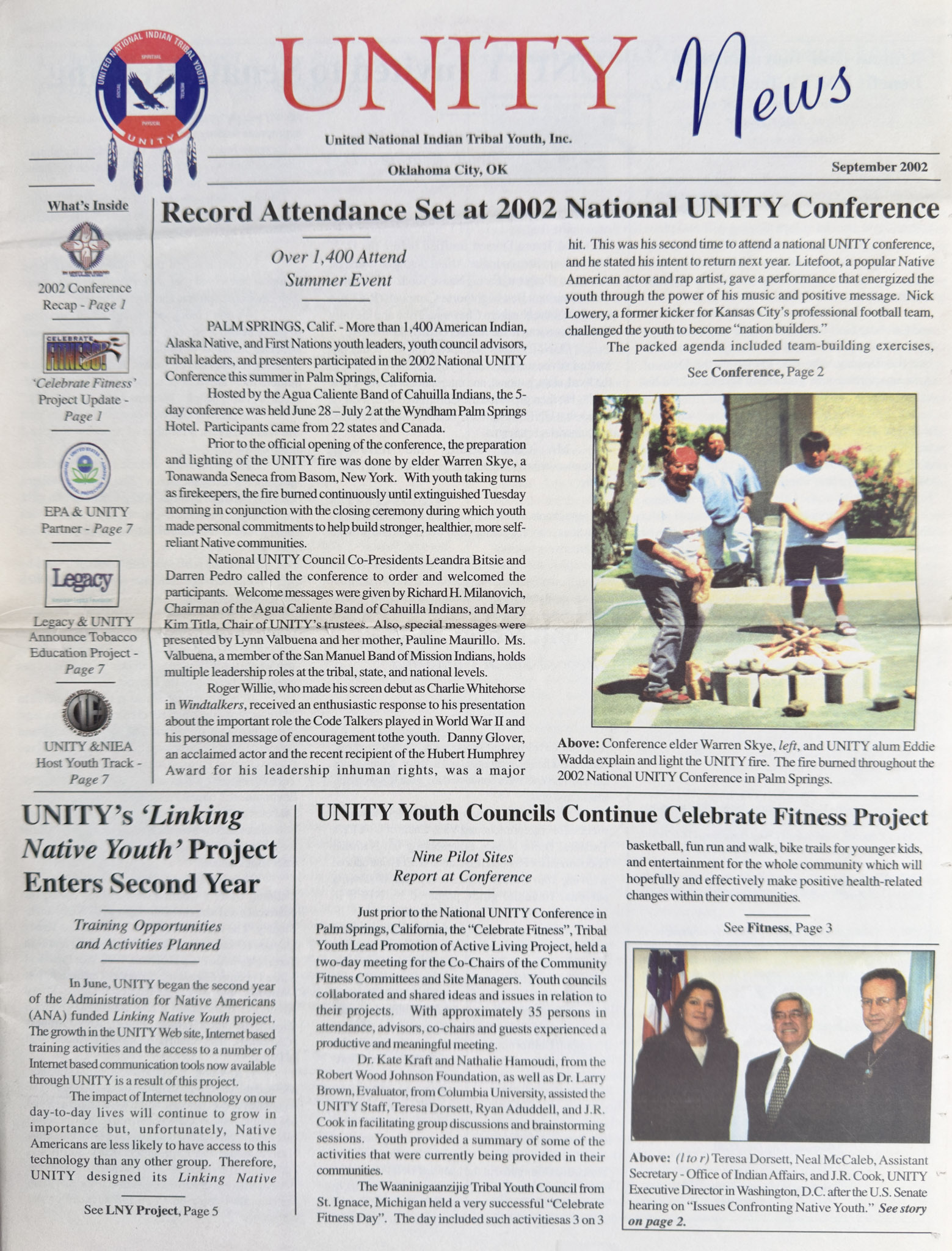 2002 — NUCEC outreach to Alaska Native Youth for creation of youth councils (Tlinget and Haida Tribes) 2003 — Dan Terrio/Kristy Dayson (Co-Presidents) invited to give “State of UNITY Youth” address before Senate Committee on Indian Affairs, Washington, DC 2006 — First Lady’s Luncheon: Four UNITY youths were invited to attend a charity luncheon benefiting UNITY and hosted by First Lady Laura Bush in Washington D.C. The luncheon was themed, “The First Americans.” During the luncheon Tony and Karl Duncan performed Hoop Dances. UNITY Executive Committee members Juanita Toledo and Joshua Tso presented gifts to Mrs. Bush on behalf of the UNITY organization. 2006 — Strengthening Native Families: UNITY conducted a project to combat social issues affecting Indian Country by strengthening Native families. 2006 — Celebrate Native Fitness: Building upon the successful ‘Celebrate Fitness’ project, the Robert Wood Johnson Foundation (RWJF) supported Celebrate Native Health with grants that allowed 13 youth councils to promote efforts within their communities to lower the barriers to healthy eating and physical activity and thereby reduce childhood obesity at community and tribal levels. (2005- 2009) 2008 — NUCEC (Vincent Toya, Jemez) gifted UNITY an Eagle Staff, used in the Opening Day Grand Entries