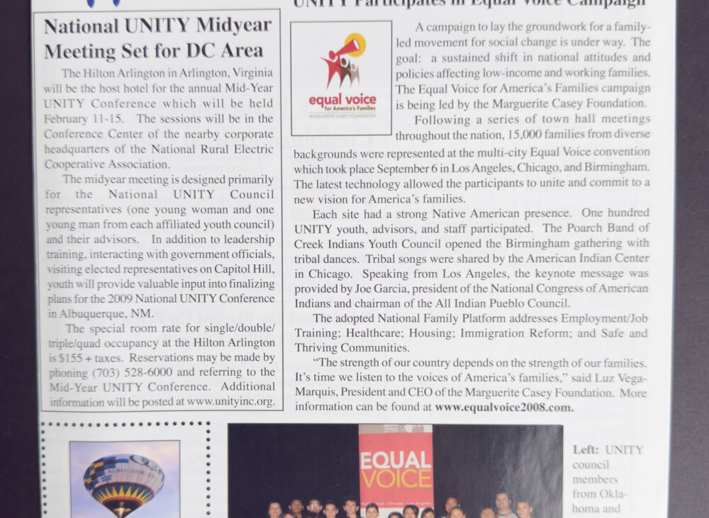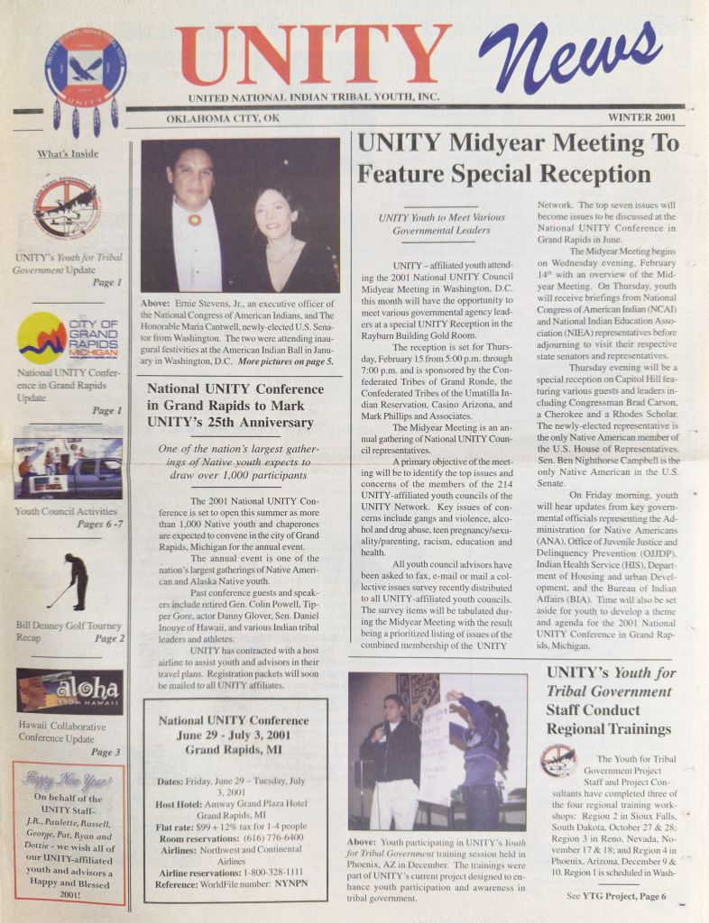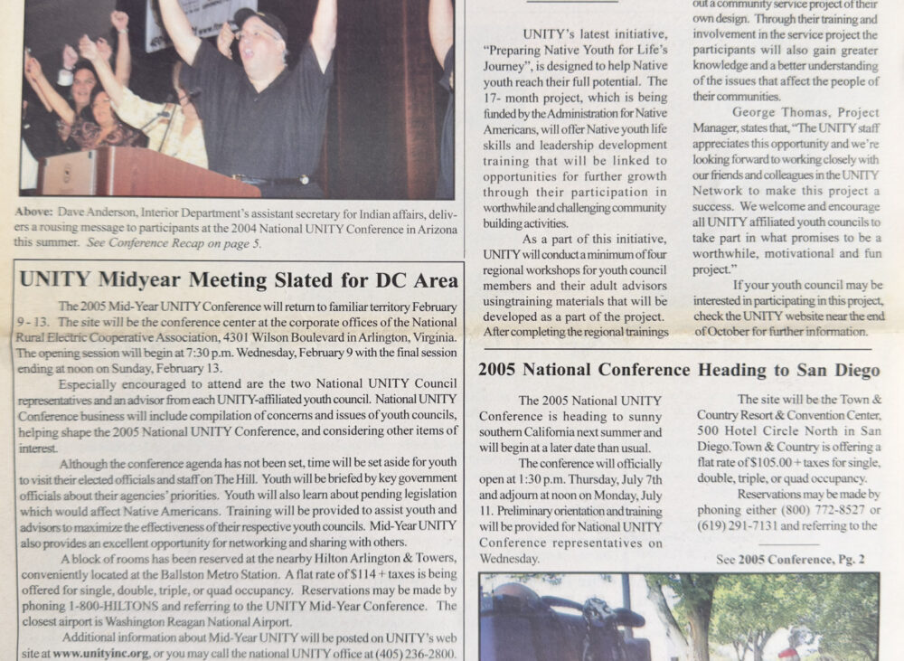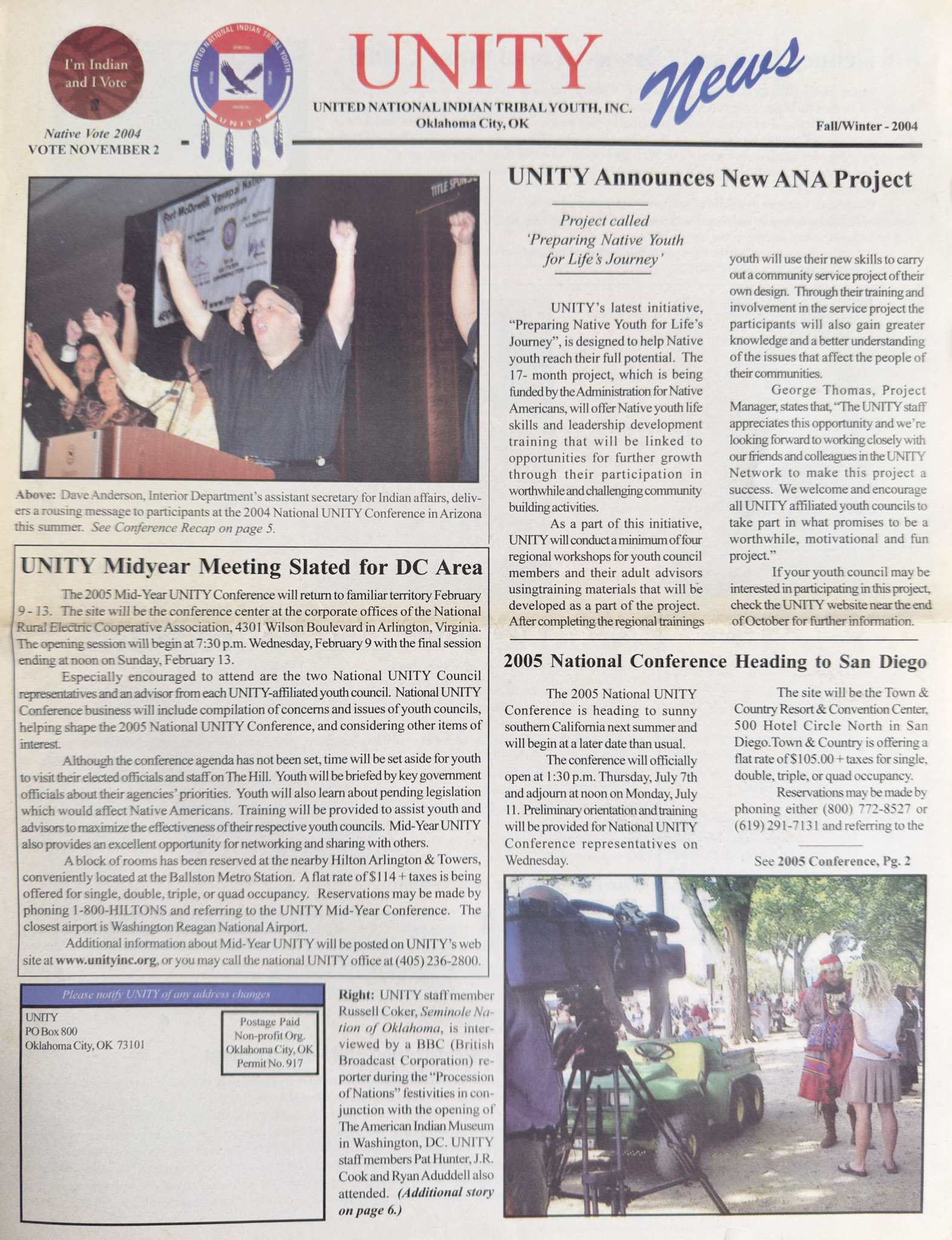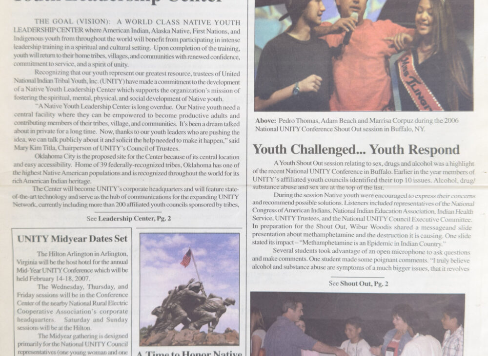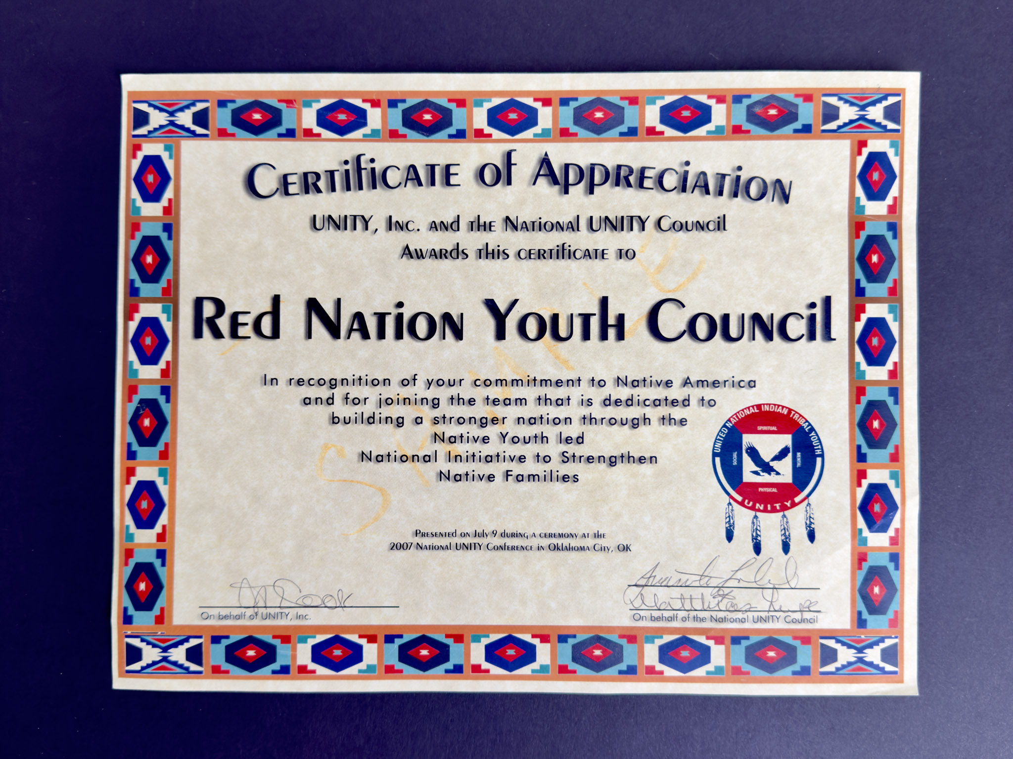 2002 — NUCEC outreach to Alaska Native Youth for creation of youth councils (Tlinget and Haida Tribes) 2003 — Dan Terrio/Kristy Dayson (Co-Presidents) invited to give “State of UNITY Youth” address before Senate Committee on Indian Affairs, Washington, DC 2006 — First Lady’s Luncheon: Four UNITY youths were invited to attend a charity luncheon benefiting UNITY and hosted by First Lady Laura Bush in Washington D.C. The luncheon was themed, “The First Americans.” During the luncheon Tony and Karl Duncan performed Hoop Dances. UNITY Executive Committee members Juanita Toledo and Joshua Tso presented gifts to Mrs. Bush on behalf of the UNITY organization. 2006 — Strengthening Native Families: UNITY conducted a project to combat social issues affecting Indian Country by strengthening Native families. 2006 — Celebrate Native Fitness: Building upon the successful ‘Celebrate Fitness’ project, the Robert Wood Johnson Foundation (RWJF) supported Celebrate Native Health with grants that allowed 13 youth councils to promote efforts within their communities to lower the barriers to healthy eating and physical activity and thereby reduce childhood obesity at community and tribal levels. (2005- 2009) 2008 — NUCEC (Vincent Toya, Jemez) gifted UNITY an Eagle Staff, used in the Opening Day Grand Entries