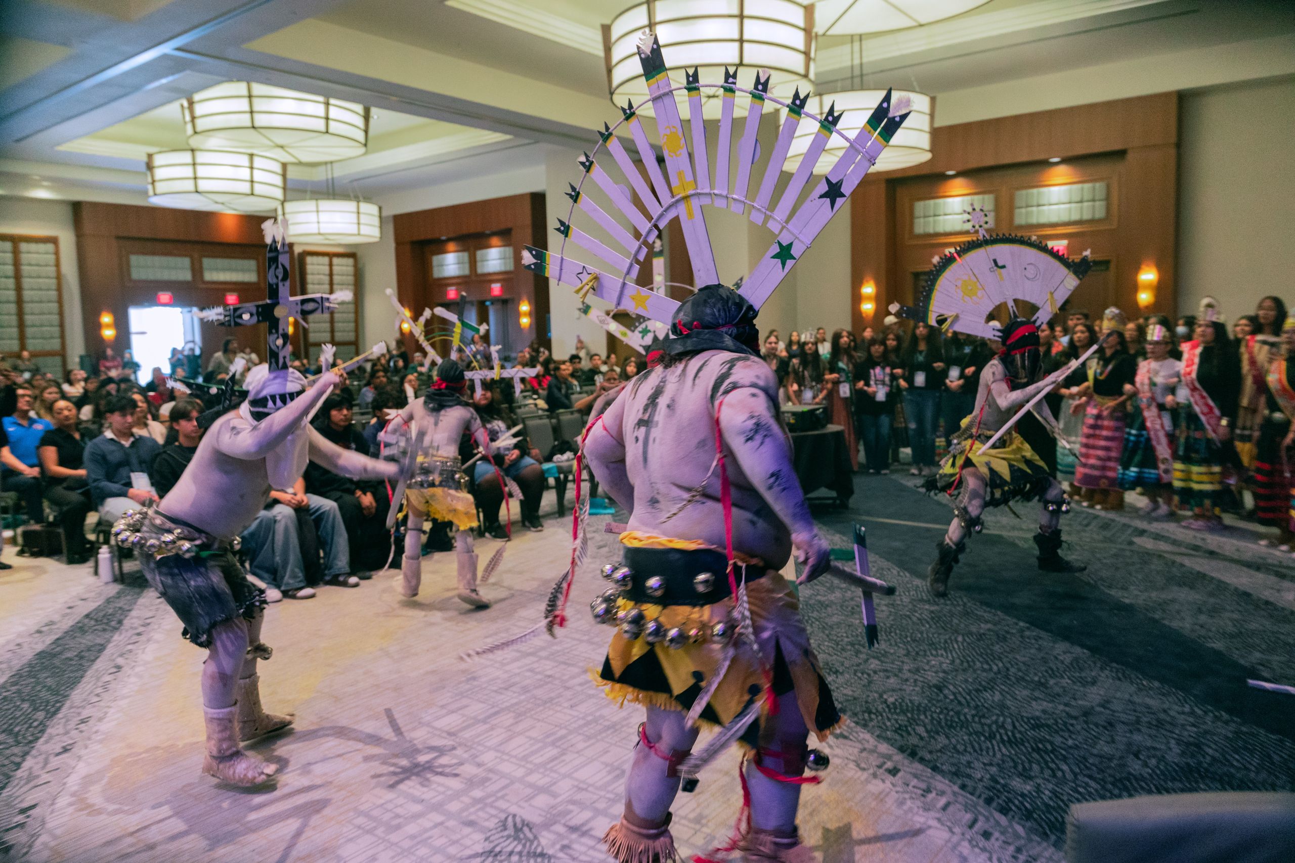 Beyond leadership training and storytelling workshops, the conference was a vibrant celebration of Indigenous culture. UNITY hosted two nights of social round dances open to the public, highlighting Indigenous storytelling through song and dance. The first night’s Round Dance was filled with energy as dozens of local hand-drummers performed and respected Stickman Nathan Littlechild shared teachings on the significance of the dance. The second night showcased the cultural traditions of the Four Sister Tribes of O’odham, featuring youth-led O’odham Cu:dk social dancing and an energetic Chicken Scratch dance with music from the “Group Passion” youth band. Over 40 singers and 37 dancers from the Tohono O’odham Nation, the Gila River Indian Community, the Ak-Chin Indian Community, and the Salt River Pima-Maricopa Indian Community participated, creating a powerful celebration of cultural identity and unity.