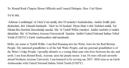 The month of August brought both transition and triumph for Navajo Earth Ambassador Vydell Willie. Between packing for his first semester of college and presenting at local chapter meetings, Vydell discovered that true leadership often means learning to balance growth in both personal and community life.