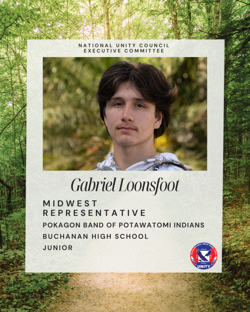 As the Midwest Regional Representative on the National UNITY Council Executive Committee, Gabriel helps represent the UNITY Network so that common concerns are studied and addressed with a positive and unified voice. He works with leaders across the country to strengthen youth councils, create spaces for meaningful dialogue, and ensure the voices of Midwest Native youth are heard at the national level. By representing his community in both UNITY’s national network and the cultural heart of the Potawatomi Gathering, Gabriel continues to uplift Native youth, foster unity, and carry forward the traditions that connect past, present, and future generations.