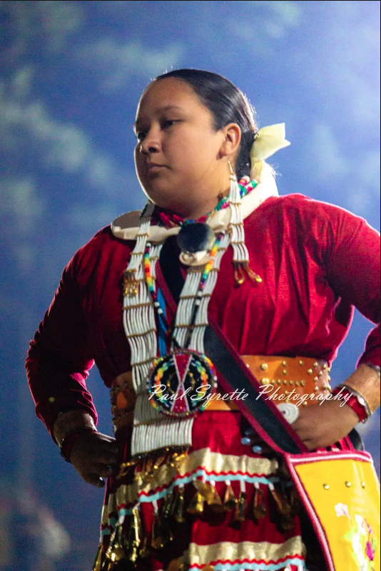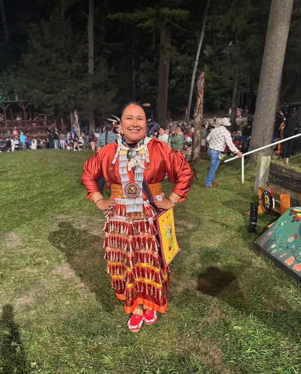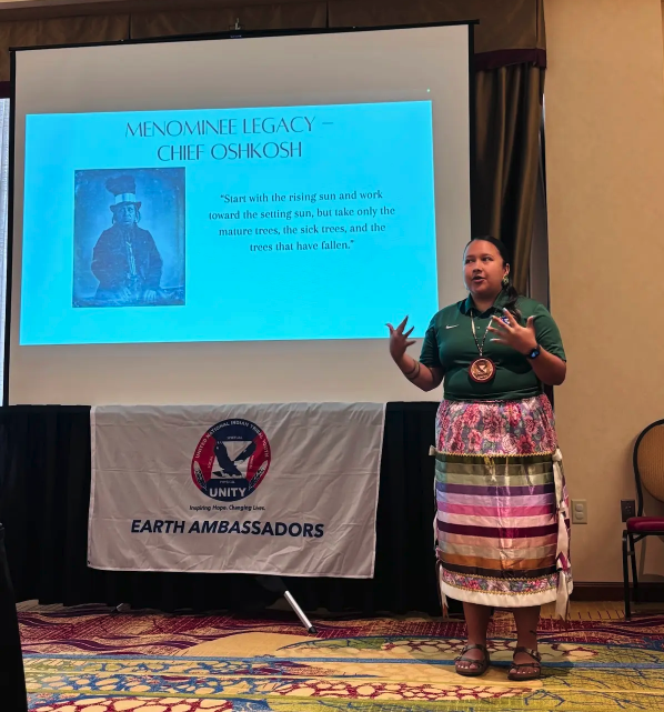 The sound of jingles echoed through the Woodland Bowl as Menominee Earth Ambassador McKaylin Peters stepped out in her new regalia—dresses she had sewn herself with care. Dancing old style jingle at her tribe’s powwow, she felt grounded in tradition and proud of the work of her own hands. Her family’s drum, the Smokeytown Singers, carried the songs as she sang backup for her uncles and grandfather. “It felt great to sing back up for my uncles and grandpa,” she said, a moment that tied family, culture, and leadership together in one circle.