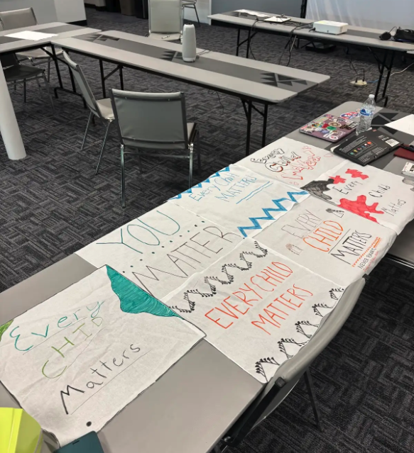 The Siletz Tribal Youth Council (STYC), which Tia helps guide, also had a busy season. The council planned the Every Child Matters Pow Wow and the Siletz CARE Every Child Matters Walk, events that brought the community together to honor children and families impacted by the residential school era. At these gatherings, STYC members hosted a booth where community members made banners, prayer ties, and orange ribbons — symbolic acts of healing and remembrance.